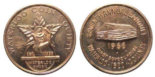 Waterloo Coin Club, 7th annual banquet, 1966 Gold medal. Obverse: hand holding a coin against a maple leaf, with WATERLOO COIN CLUB, EST. 1959, WATERLOO ONTARIO. Reverse: log cabin with SEVENTH ANNUAL BANQUET WATERLOO 1820 COUNTY, 1966, FIRST SCHOOL HOUSE