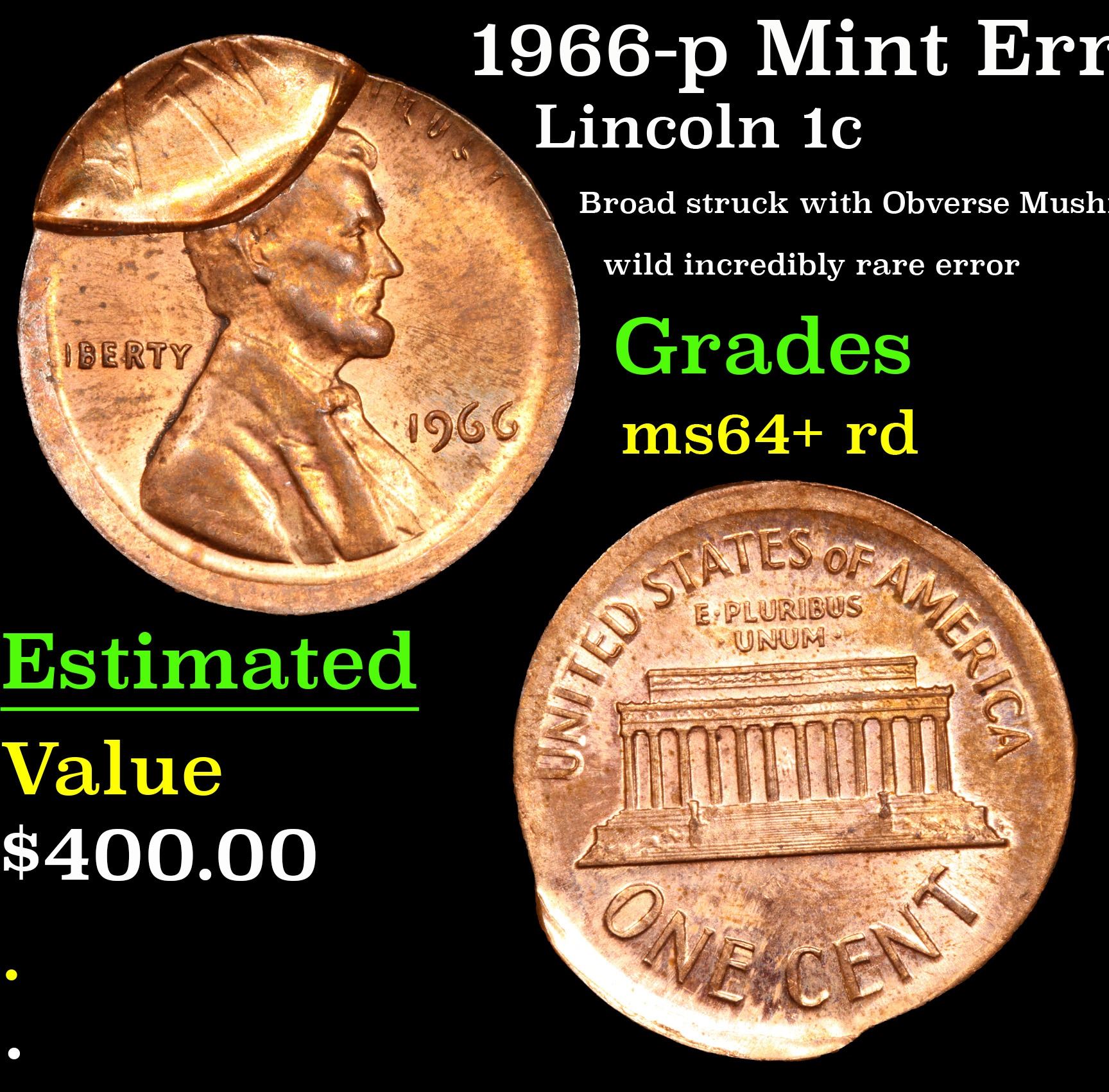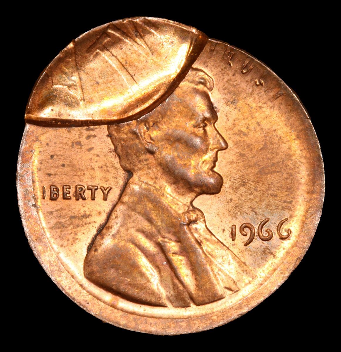 1966-p Mint Error, Broadstruck w/Obv. Brockage Broad struck with Obverse Mushroom Brockage wild incredibly rare error Lincoln Cent 1c Grades Choice+ Unc RD. A Corey's Pick, Bid to Win, Don't let it get Away Coin