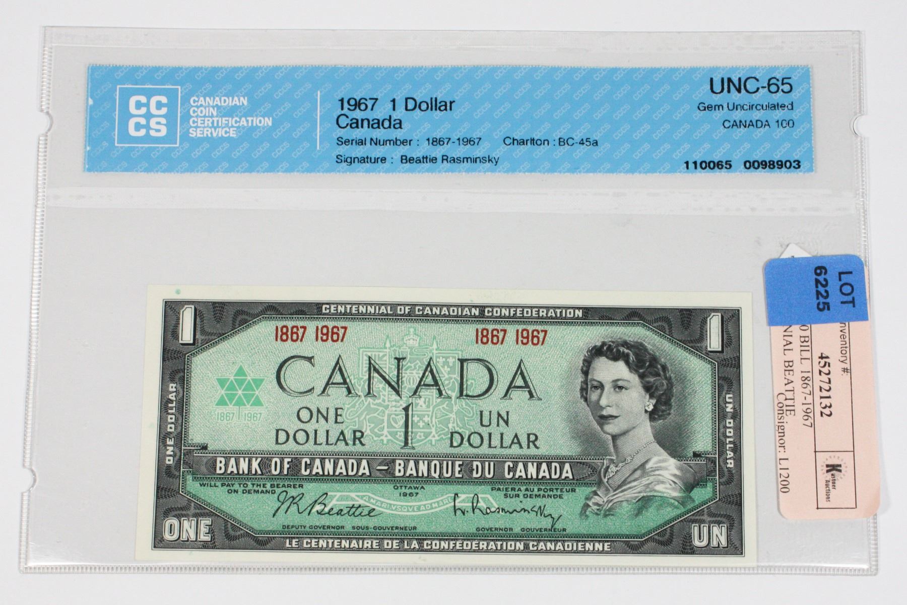 RAMINSKY GRADED BY C.C.C.S GEM UNCIRCULATED - 65HIGH GRADE FROM ORIGINAL 100 PACKAGE. One of the very best quality and colorful bills, the 1867-1967 bills , from the 100 package and grade, research bill grades, look at earlier bills in auction