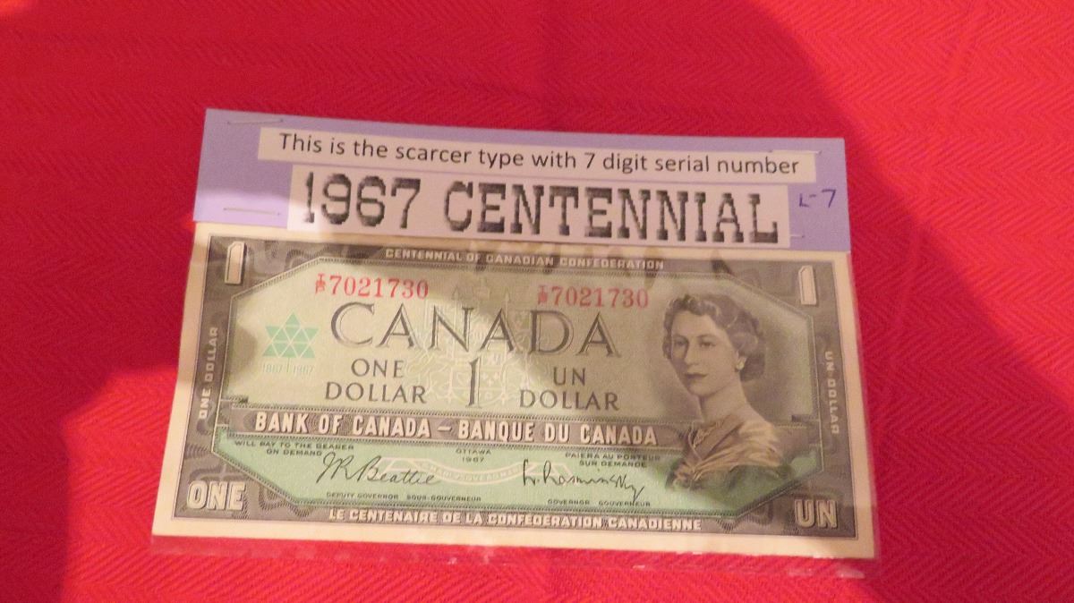 1967 $1.00 centenial year – Scarcer type - 7 digit serial number