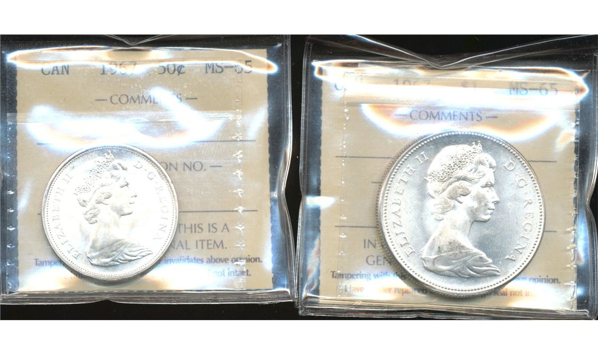 1967 $1 & 1967 50¢ ICCS MS65. Lot of 2 coins both brilliant white.