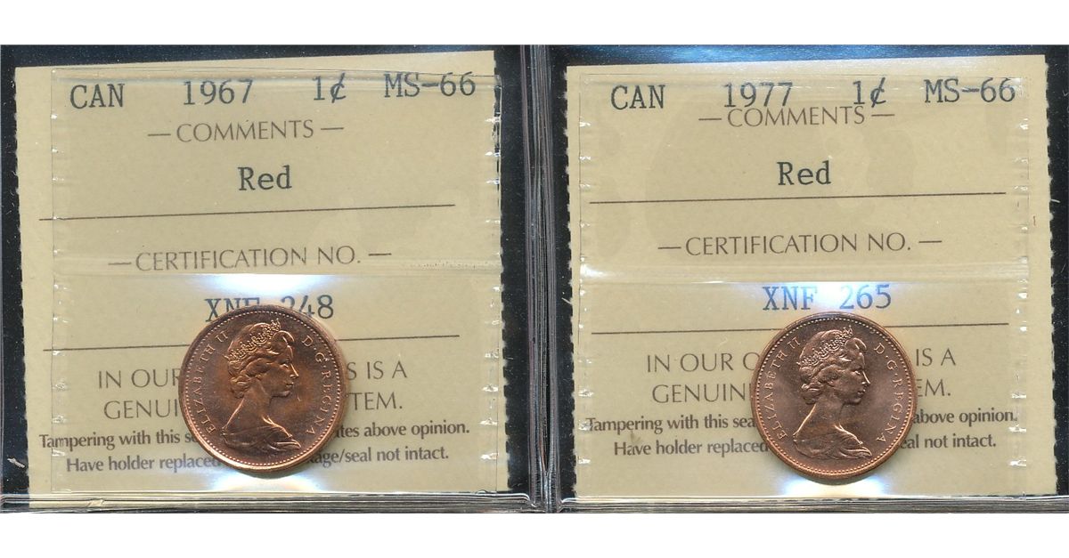 1967 1¢ & 1977 ICCS MS66RD. Lot of 2 gem coins.