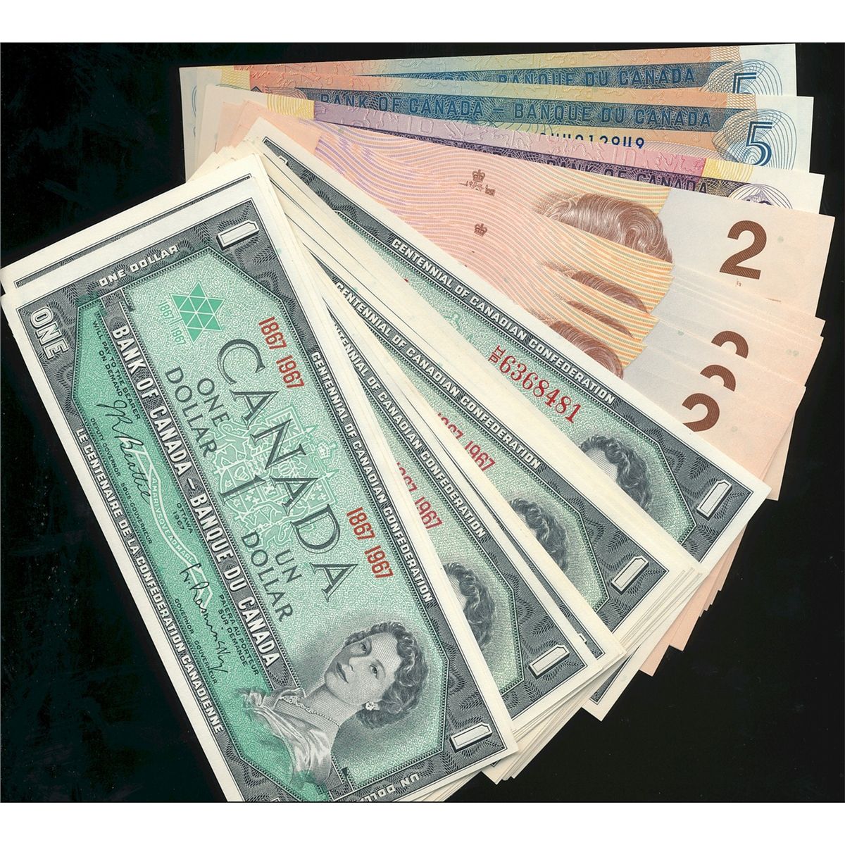 1967 $1 BC-45a(19), BC-45b-i(2), 1972 $5 BC-48a(2), 1971 $10 BC-49b(2) & 1986 $2 BC-55b(10)