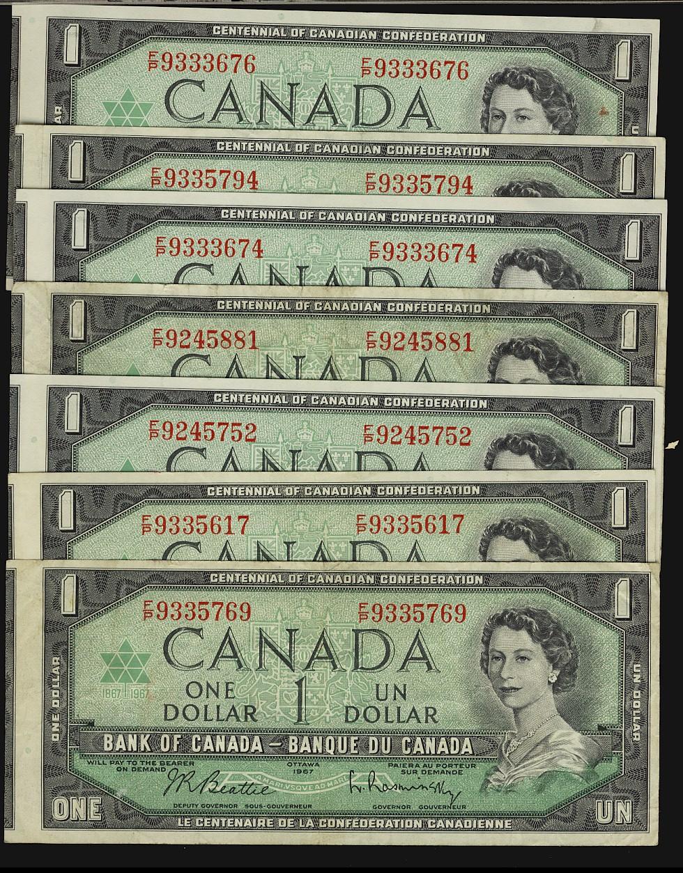 1967 $1 BC-45a, ERROR notes. Lot of 7 offset/miscut notes.