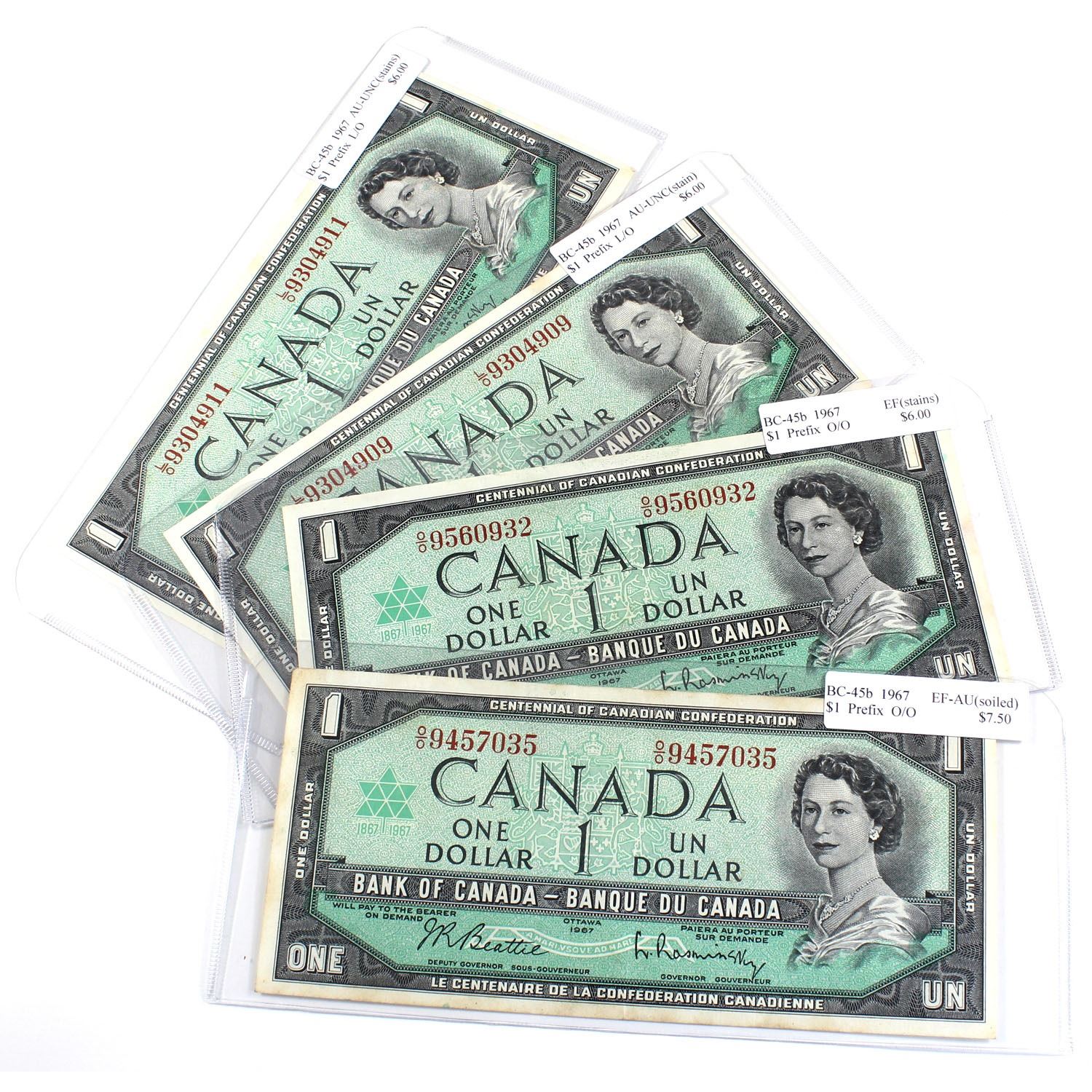 1967 $1 BC-45b Bank of Canada Notes with Beattie-Rasminsky Signatures - 2x O/O & 2x L/O Prefixes. EF to AU-UNC. Notes contain minor staining or soiling. 4pcs