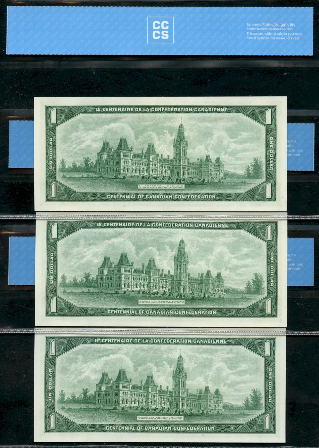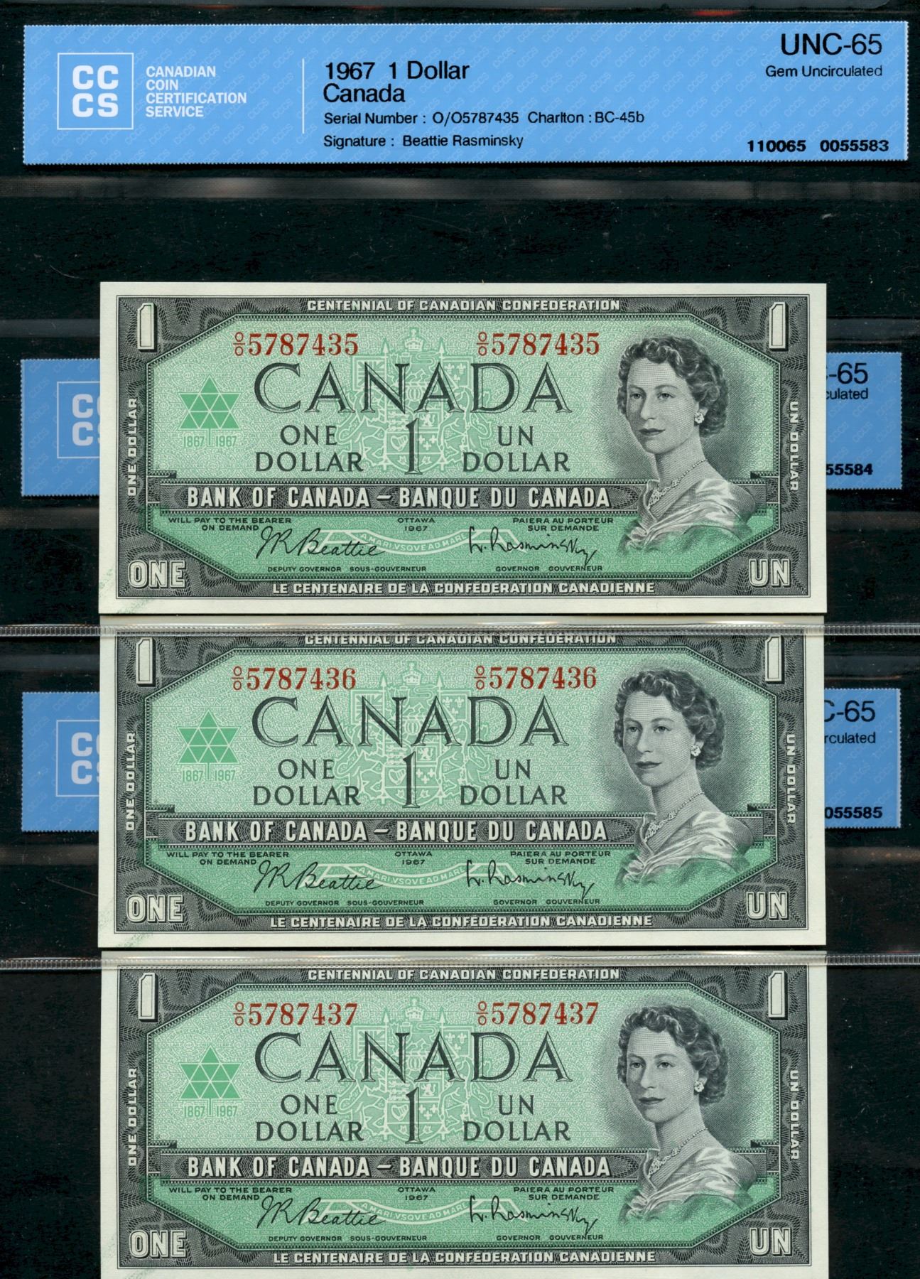 1967 $1 BC-45b #OO5787435-437, CCCS Gem Uncirculated-65.  Lot of 3 consecutive notes.