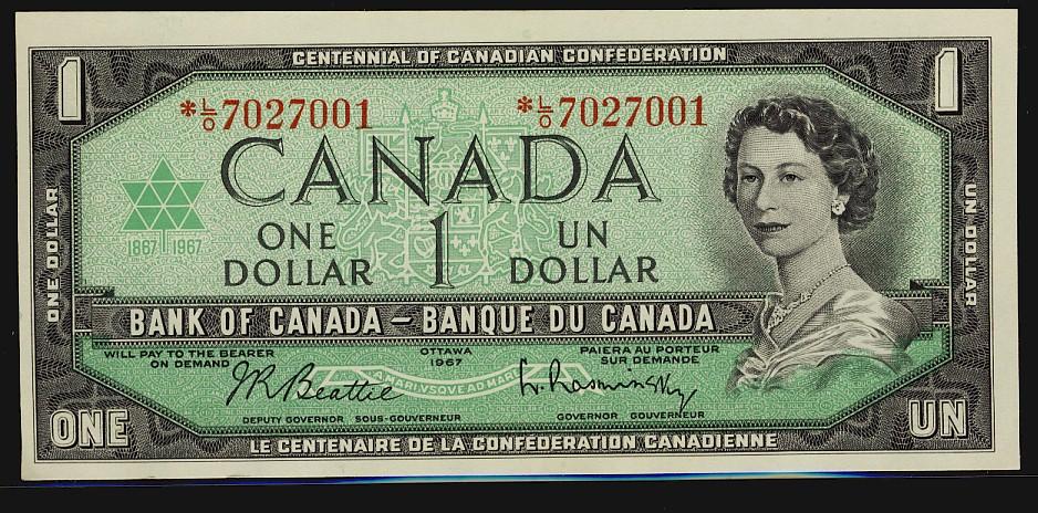 1967 $1 BC-45bA. #*LO7027001, a lovely Choice UNC example.