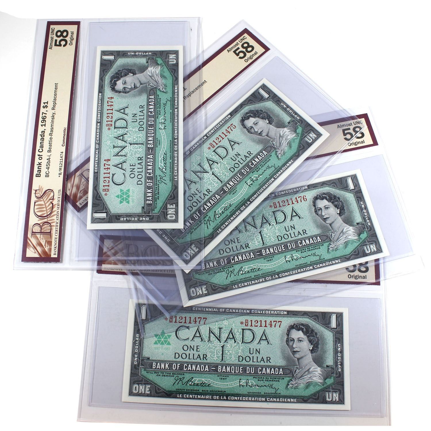 1967 $1 BC-45bA-i, Beattie-Rasminsky, Replacement, Consecutive Order Notes S/N: *B/M1211474-77. 4 no