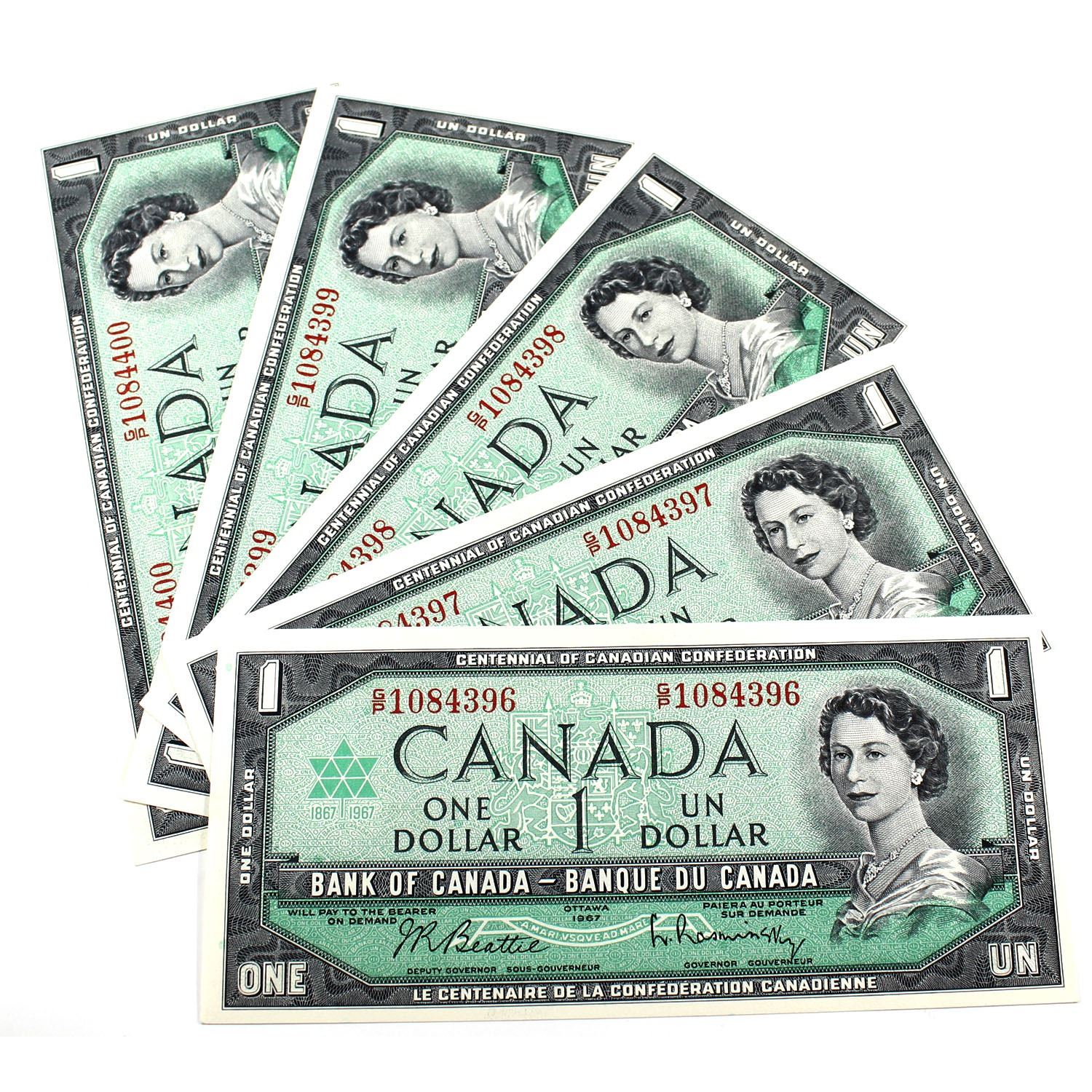 1967 $1 Bank of Canada Notes Beattie-Rasminsky Signature with Consecutive Serial Numbers G/P1084396-G/P1084400. 5pcs