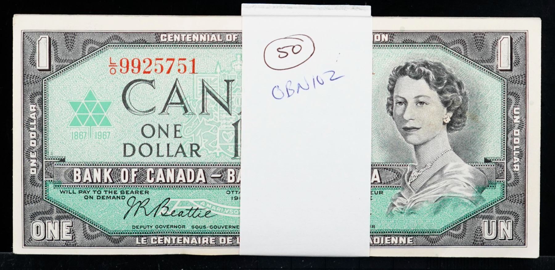 1967 $1 "Bundle of 50 notes" BC-45b L/O9925751-9925800, all notes Unc or better.