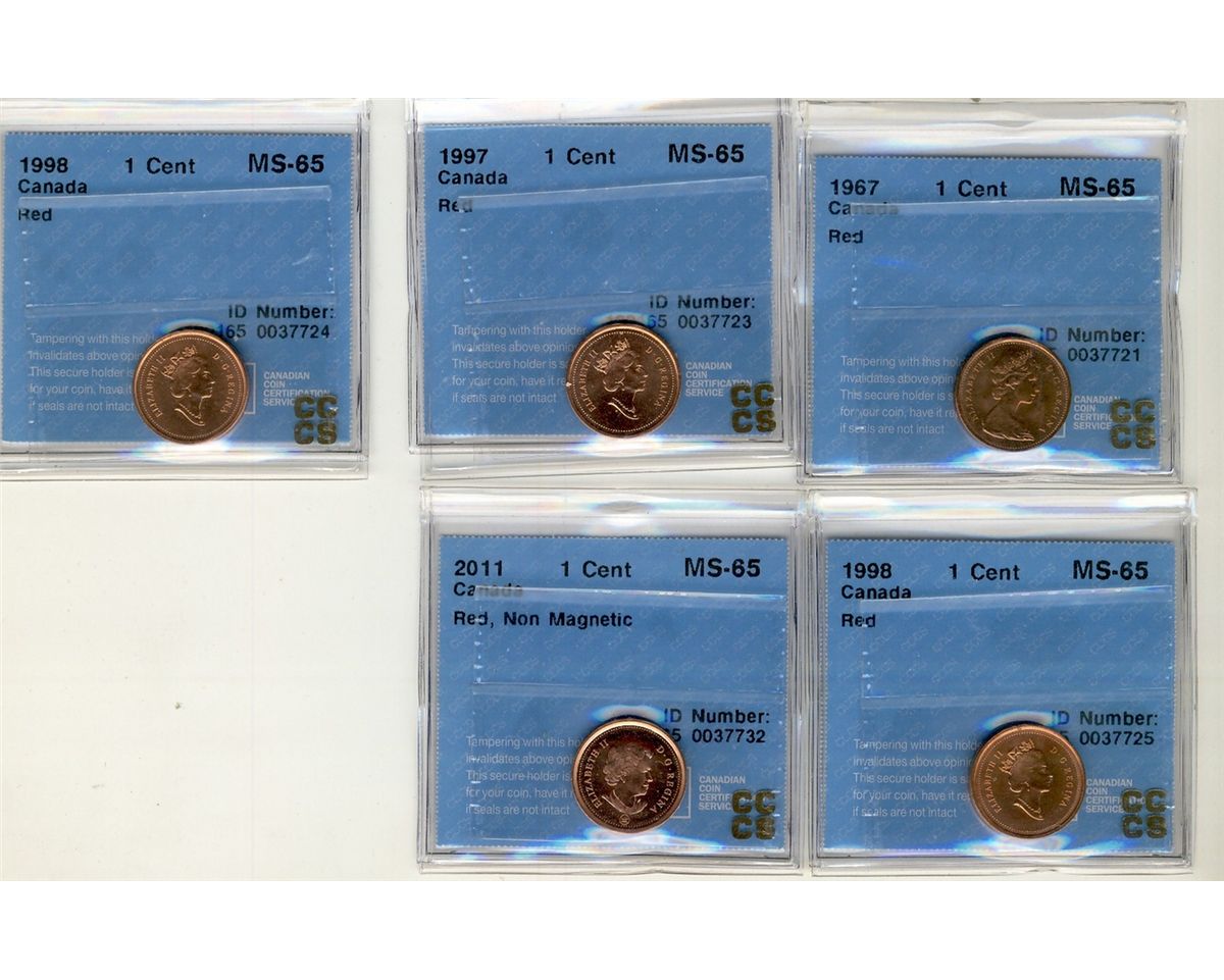 1967 1 Cent, 1997, 1998(2), 2011 Non Mag, CCCS MS65; Five coins.