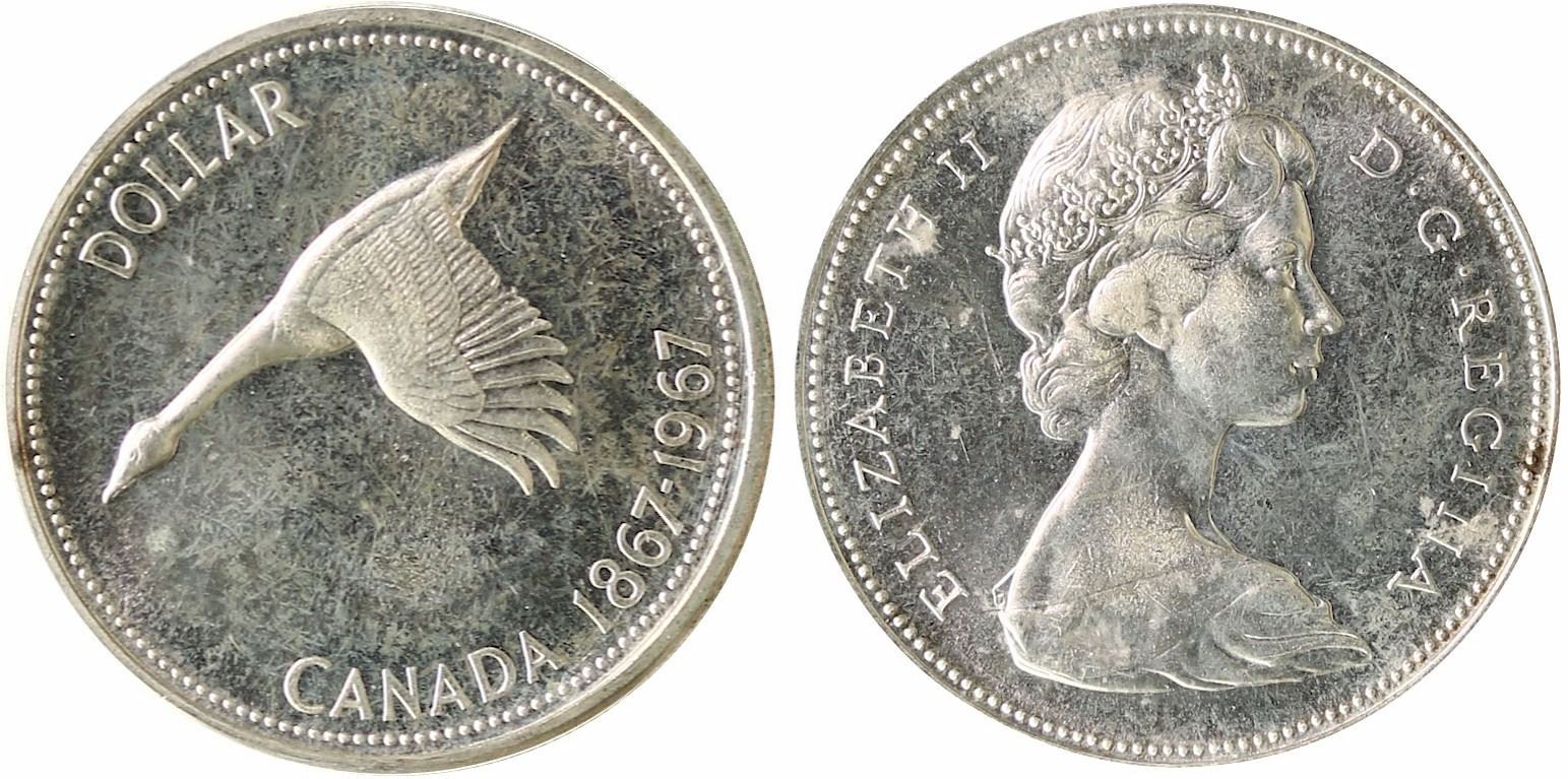 1967 $1 "Diving Goose" ICCS Very Choice Mint State-64. Fully brilliant with great reflective surfaces. A similar example sold at our 2025 New Year's sale for $3585.