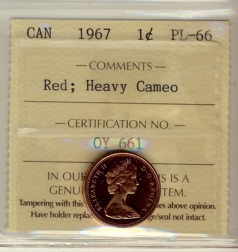 1967 1¢ ICCS PL66RD Heavy Cameo. Only 1 listed in POP report.