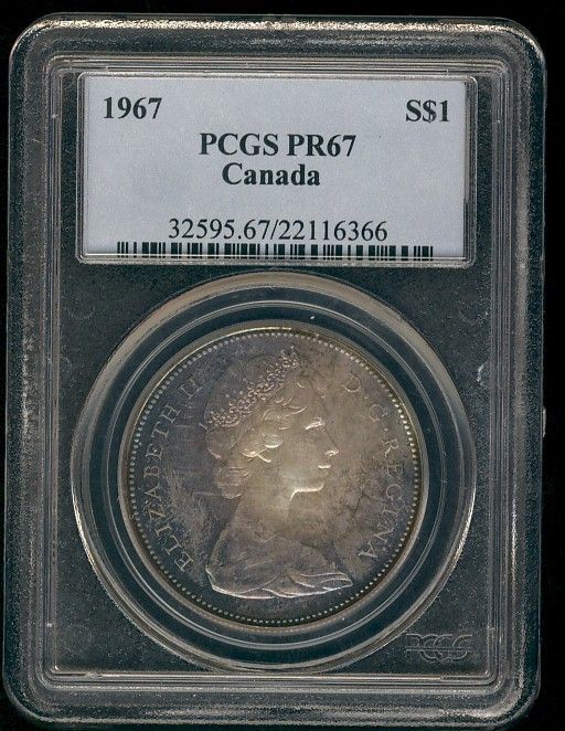 1967 $1 PCGS PR67. Coin should designate Specimen. Great eye appeal with bluish to green tints.