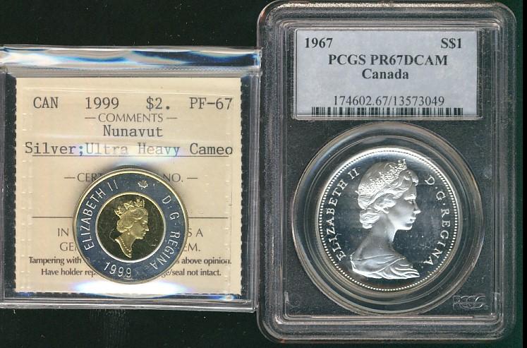 1967 $1 PCGS PR67DCAM & 1999 $2 Nunavut, Silver ICCS PF67 Ultra Heavy Cameo.