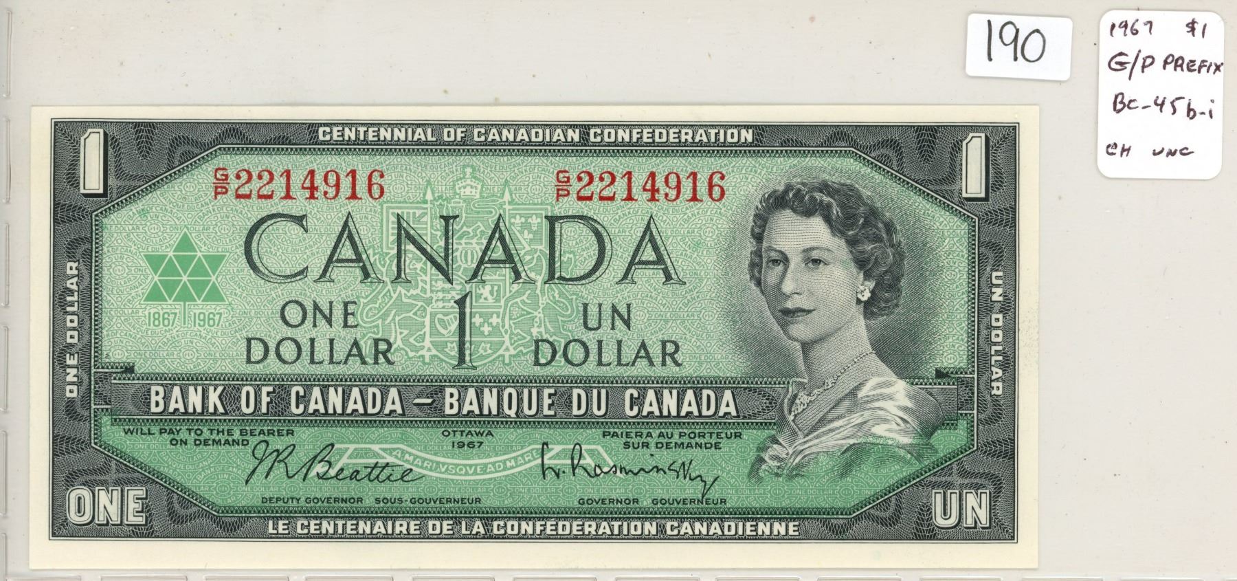 1967 $1. With Serial Numbers. Beattie-Rasminskiy signatures. G/P Prefix. BC-45b-i. Choice Uncirculated.
