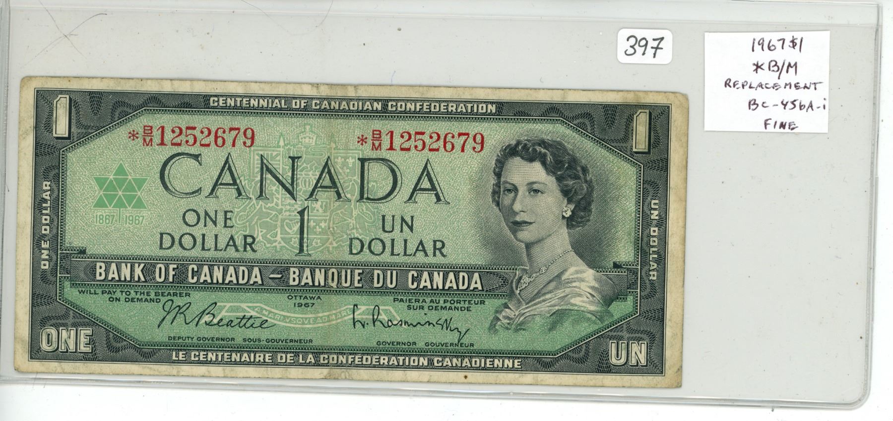 1967 $1 note with Serial Numbers. Beattie-Rasminsky signatures. *B/M Replacement Prefix. BC-4tbA-i. F-12.