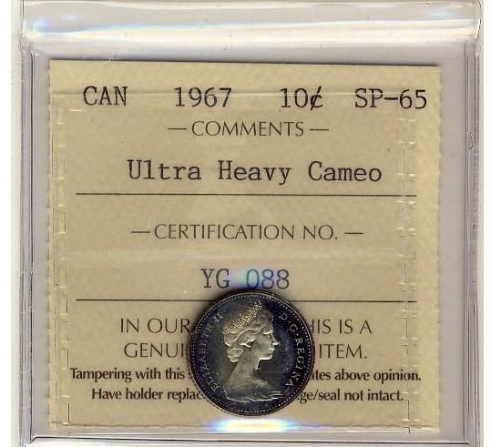 1967 10¢ ICCS SP65 ULTRA HEAVY CAMEO, lightly toned.
