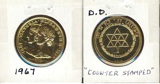 1967 100th Confederation Gold plated Medal. Coin shows counterstamp 'THE 14 OLD TIME SALESMEN'. Should be viewed.