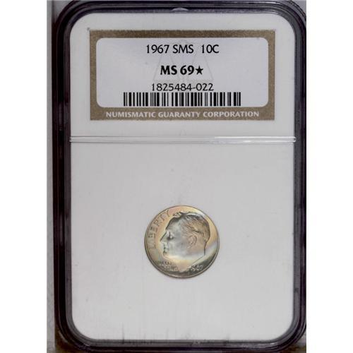 <B>1967<10C> SMS MS69 <img border='0' src='http://www.heritagecoins.com/images/star.gif' width=10 height=10> NGC.</B></I> Fully struck and pristine, with lovely rainbow toning on both sides. As of (3/06), the only 1967 SMS MS69 <img border='0' src='http://www.heritagecoins.com/images/star.gif' width=10 height=10> certified by NGC, and arguably the finest certified, although four pieces have been certified SMS MS69 Cameo, and an additional four are graded SMS MS68 Ultra Cameo.