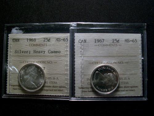 1967 & 1968 25¢ ICCS MS65, Lot of two coins, both blast white, the 1968 is Heavy Cameo.