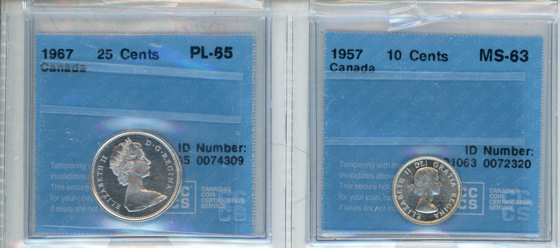 1967 25 Cent (PL-65) and 1957 10 cent (MS-63) CCCS Graded