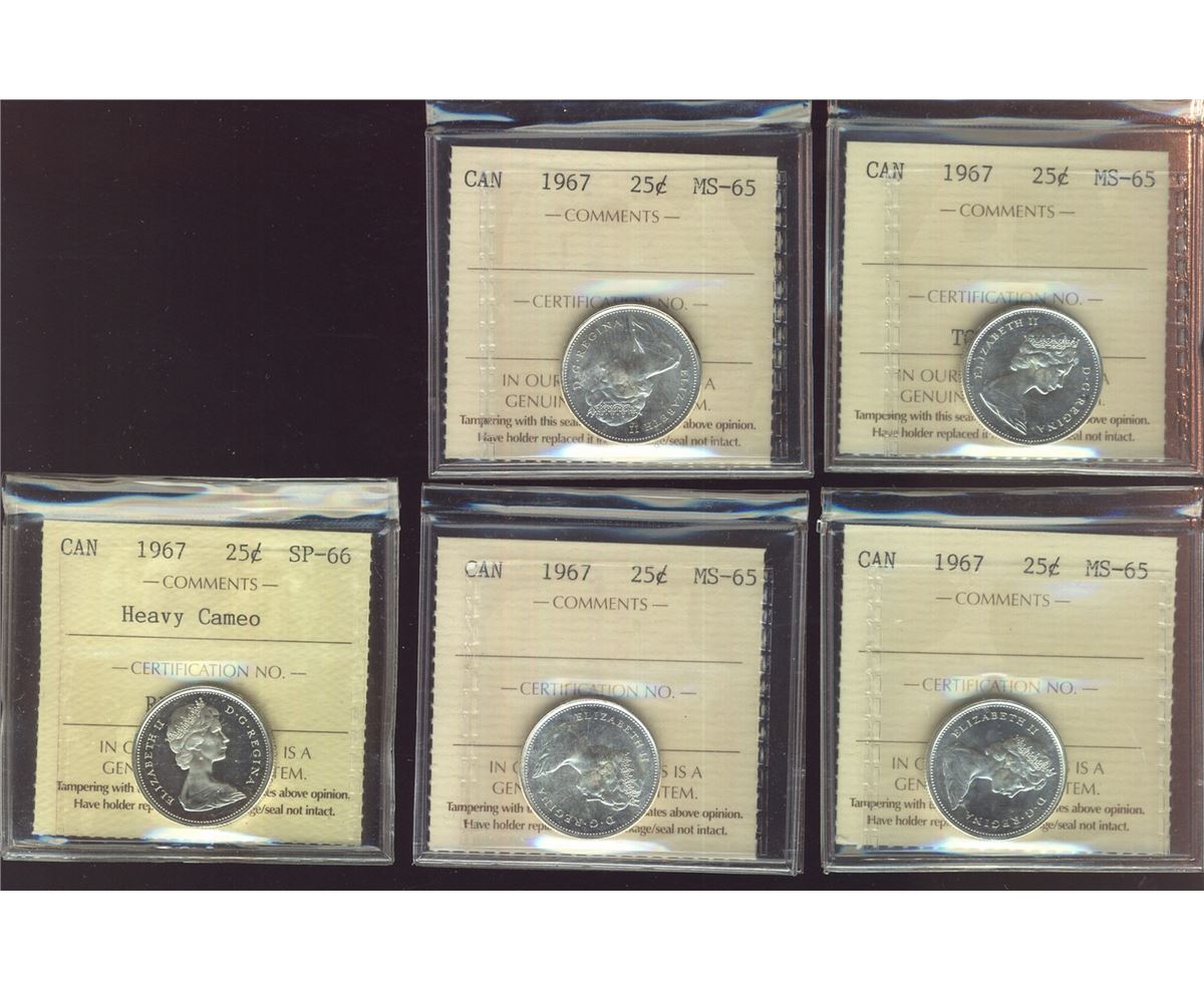 1967 25¢ ICCS MS65. Lot of 5 coins with 1 designated Heavy Cameo.