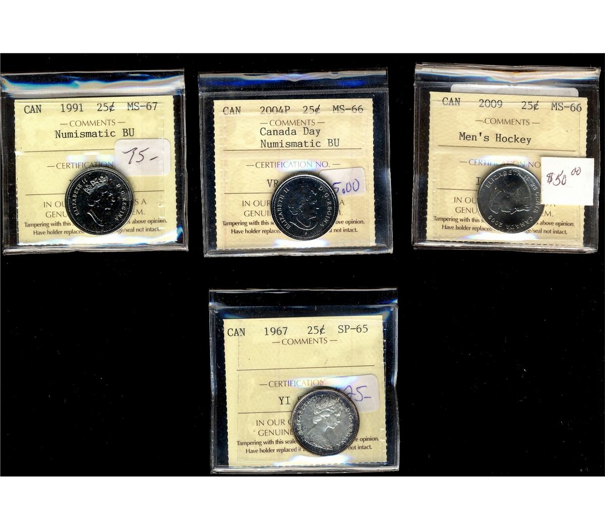 1967 25¢ SP65, 1991 MS67NBU, 2004P Canada MS66NBU & 2009 Hockey MS66. Lot of 4 ICCS graded coins.