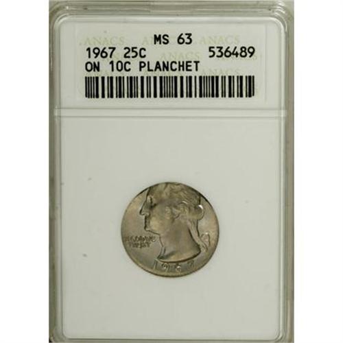 <B>1967 25C Washington Quarter--On a Dime Planchet--MS63 ANACS.</B></I> A lustrous and lightly toned sky-blue and gold example. Uncentered toward 12 o'clock with LIBERTY and the denomination off the flan. Struck from worn dies, a secondary mint error.<BR><BR><B>Coin Engraver:</B> John Flanagan<BR><BR><b>Shipping:</b> Coins & Currency (<a target="_blank" href="http://www.heritageauctions.com/common/shipping.php">view shipping information</a>)