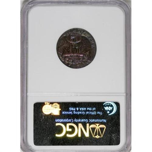 <B>1967 25C Washington Quarter--Struck on a Cent Planchet--MS63 Brown NGC.</B></I> 3.1 grams. Deep reddish-turquoise toning covers the surfaces of this wrong planchet error. Uncentered toward 10 o'clock with the right side of the obverse and reverse complete. Most of the date is also present.<BR><BR><B>Coin Engraver:</B> John Flanagan<BR><BR><b>Shipping:</b> Coins & Currency (<a target="_blank" href="http://www.heritageauctions.com/common/shipping.php">view shipping information</a>)