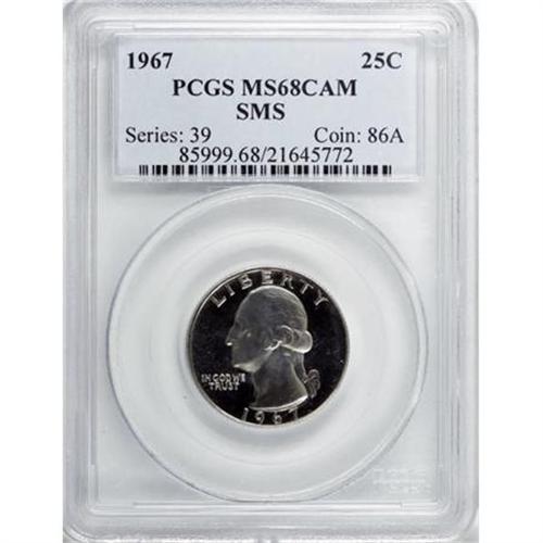 <B>1967 25C SMS MS68 Cameo PCGS.</B></I> PCGS Population (40/1). NGC Census: (59/0). (#85999)<BR><BR><b>Shipping:</b> Coins & Currency (<a target="_blank" href="http://www.heritageauctions.com/common/shipping.php">view shipping information</a>)
