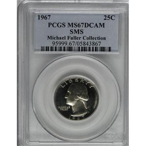 <B>1967 25C SMS MS67 Deep Cameo PCGS.</B></I> This nearly brilliant Superb Gem exhibits impressive contrast between the mirrored fields and the luminous devices. Die polish, as made, has removed a few feather fragments and accompanying mint frost from the eagle. Population: 12 in 67 Deep Cameo, 2 finer (10/07). <BR><I>From The Michael Fuller Collection.</B></I><BR><BR><b>Shipping:</b> Coins & Currency (<a target="_blank" href="http://www.heritageauctions.com/common/shipping.php">view shipping information</a>)