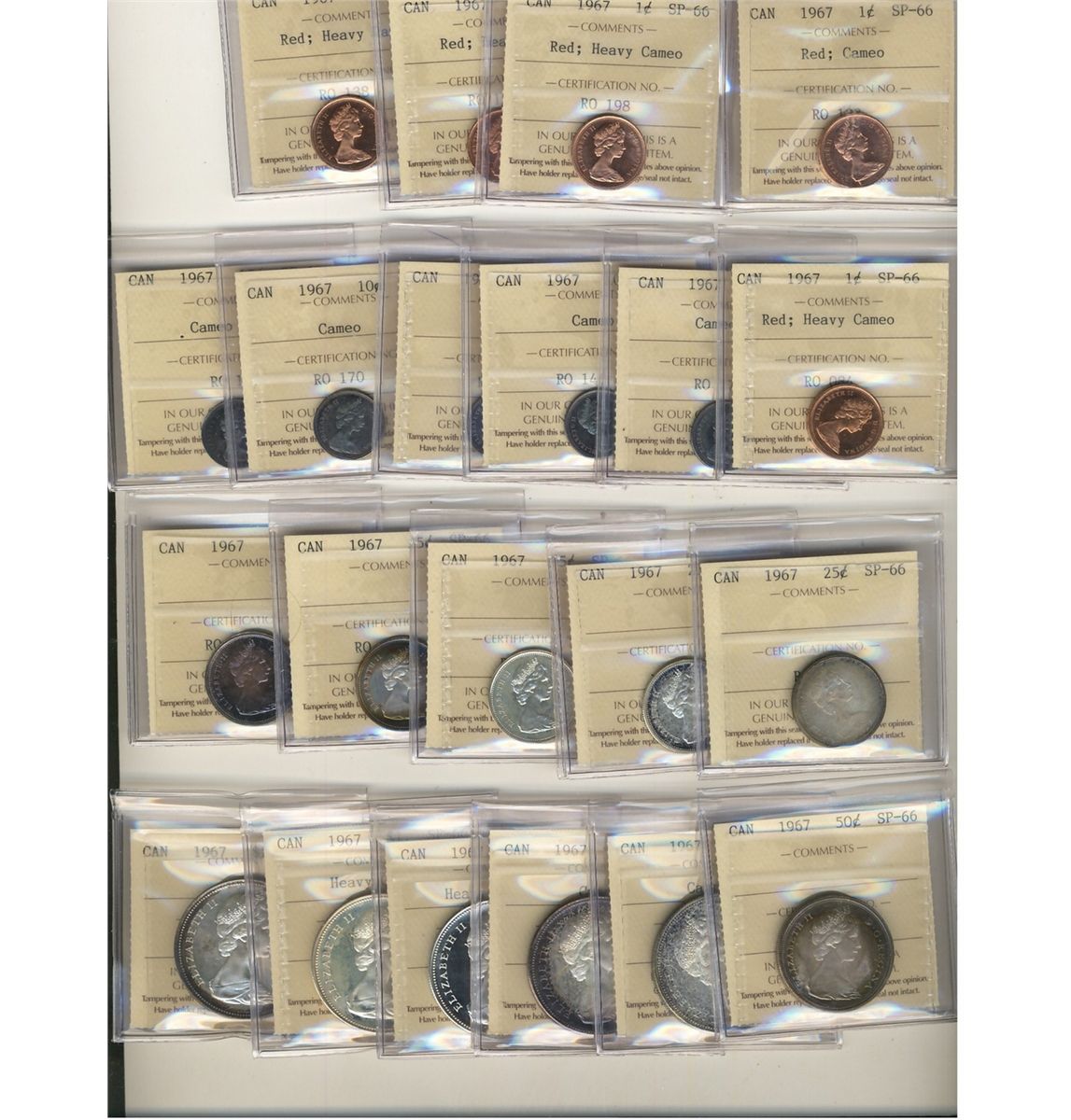 1967(5) 1¢, 10¢(5), 25¢(5), 50¢(1) & $1(5) all ICCS SP66. Lot of 21 coins with several designations of Cameo to Heavy Cameo.