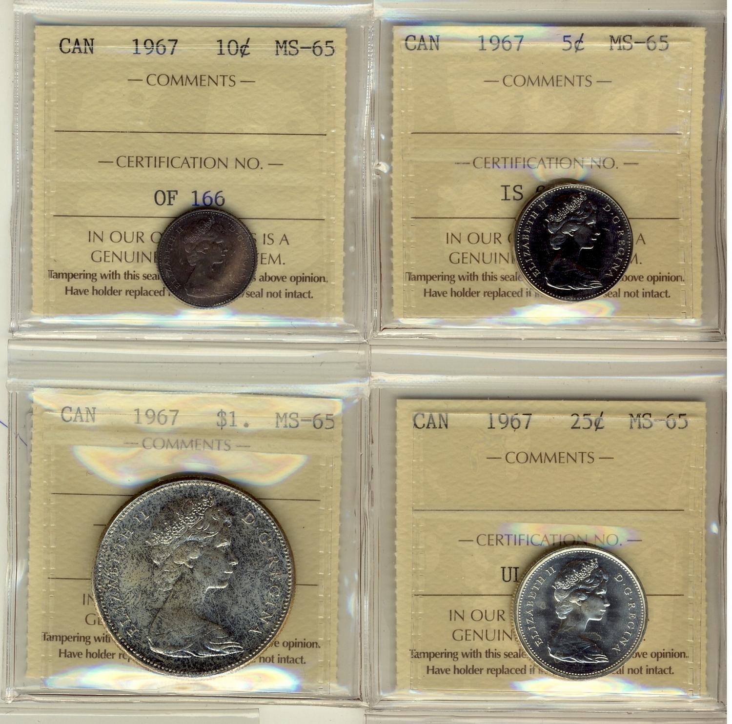 1967 5¢, 10¢, 25¢ & $1 all ICCS MS65. Lot of 4 coins, all Gems. Superb collectors set.
