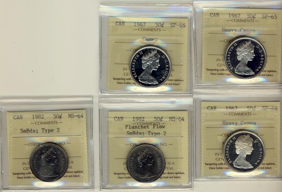 1967 50¢ ICCS SP65 Hvy Cam, SP66 Hvy Cam & SP66 Cam along with 1982 SmBds T.2 ICCS MS64(2), one with planchet flaw. Lot of 5 coins.