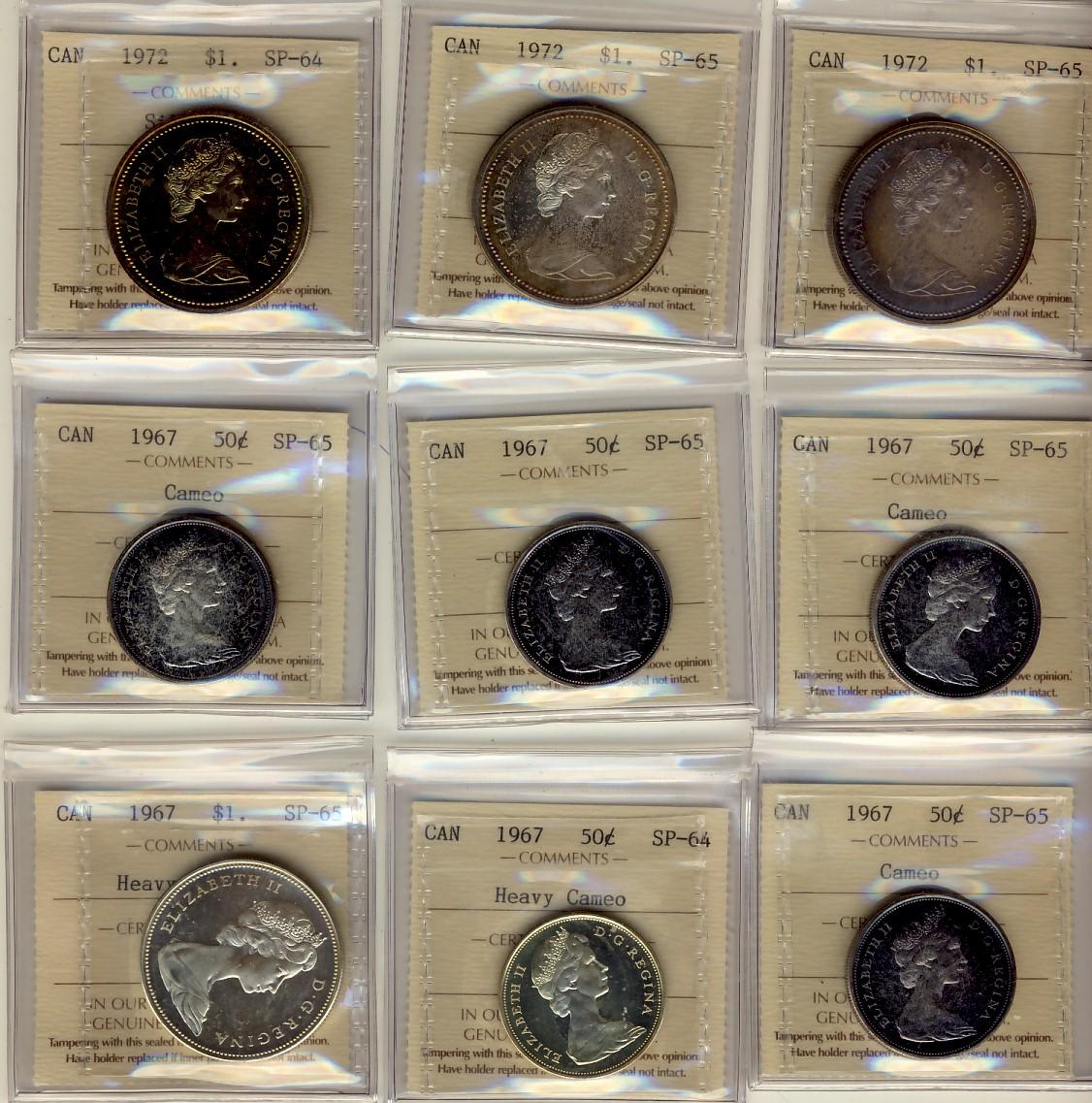 1967 50¢ SP64 Heavy Cameo, SP65(4) three with Cameo designation and $1 SP65 Heavy Cam. Also includes 1972 $1 SP64 & SP65(2). Lot of 9 coins.