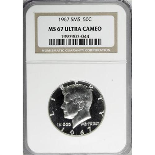 <B>1967 50C SMS MS67 Deep Cameo NGC.</B></I> NGC Census: (71/8). PCGS Population (0/0). Numismedia Wsl. Price for NGC/PCGS coin in MS67: $625. (#96847)<BR><BR><b>Shipping:</b> Coins & Currency (<a target="_blank" href="http://www.heritageauctions.com/common/shipping.php">view shipping information</a>)