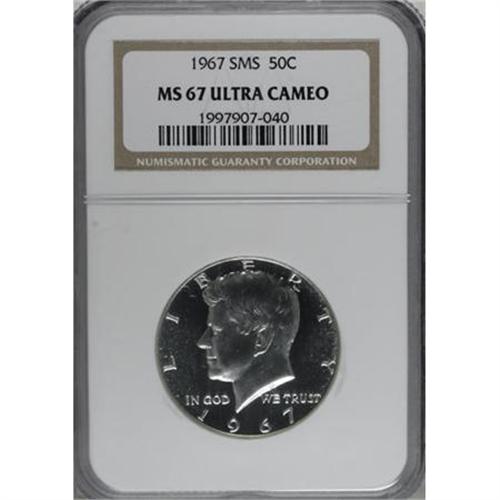 <B>1967 50C SMS MS67 Deep Cameo NGC.</B></I> NGC Census: (71/8). PCGS Population (61/6). Numismedia Wsl. Price: $625. (#96847)<BR><BR><b>Shipping:</b> Coin/Currency (<a target="_blank" href="http://www.heritageauctions.com/common/shipping.php">view shipping information</a>)