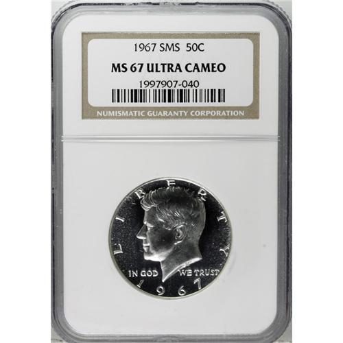 <B>1967 50C SMS MS67 Deep Cameo NGC.</B></I> NGC Census: (71/8). PCGS Population (61/6). Numismedia Wsl. Price: $625. (#96847)<BR><BR><b>Shipping:</b> Coin/Currency (<a target="_blank" href="http://www.heritageauctions.com/common/shipping.php">view shipping information</a>)