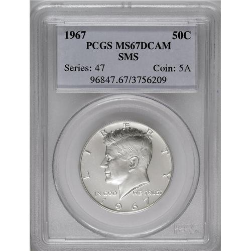 <B>1967<50C> SMS MS67 Deep Cameo PCGS.</B></I> Strong contrast for this Special Mint Set issue and highly desirable for the quality of the surfaces and eye appeal. No signs of toning and virtually as struck. Population: 55 in 67, 6 finer (3/06).<BR><I>From The J. S. Hamilton Registry Set of Proof Kennedy Half Dollars.</B></I> <BR><BR><B>Important notice:</B> Heritage usually auctions material at the rate of 200-250 lots per hour. On some occasions eBay Live bid software or the Internet may not be able to keep up with the pace of the auction. We recommend placing a realistic absentee bid now as insurance to avoid disappointment. Occasionally the auctioneer may eliminate or reject an eBay Live bid, and the auctioneer may also reopen a lot after the close of the eBay live bidding (usually because we missed an audience bid), and may reject your bid even if it shows you as the winning bidder. By bidding via eBay Live, you agree that Heritage may award the lot to another bidder at its sole discretion under the circumstances described above or any other reasonable circumstances. Since eBay bids are not shown to us until we open the lot on the floor, we treat those bids just like floor bids. In most cases the floor responds before the eBay bid is presented to us, due to Internet lag time, so for consistency we have made it a policy that floor bids are always considered first over tie eBay live bids. Also please note that all Heritage lots purchased through eBay Live carry a 20% Buyer's Premium. Please make sure you read the Terms and Conditions before you bid. This lot is being auctioned in conjunction with a live floor auction by Heritage Galleries & Auctioneers. All final auction and invoice information will be supplied by Heritage Galleries & Auctioneers, and all other information should be considered preliminary. Lot:3168 <BR><BR><B>Winning Notification and Billing:</B> After the FINAL session in this auction is complete, Heritage will send e-mail and snail mail invoices. This process normally takes several days. All final auction and invoice information will be supplied by Heritage Galleries & Auctioneers, and all other information should be considered preliminary. <BR><BR>This auction will be conducted on a live auction floor and over the Internet through eBay Live. If you choose to place an absentee bid, please take a moment to <font color='#0000ff'><u><a href='http://pages.ebay.com/liveauctions/help/before/laabsentee.html'>learn how eBay Live absentee bidding works</a></u></font><font color='#000000'>