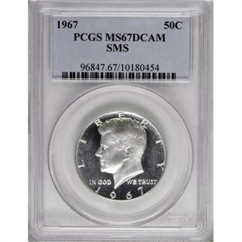 <B>1967 50C SMS MS67 Deep Cameo PCGS.</B></I> Though not strictly a proof, this piece has the richly frosted devices and limpid mirrors of such a coin. Only a hint of softness on the portrait hints at this piece's Special Mint Set origin. Carefully preserved and pleasing. PCGS has graded six finer Deep Cameo examples (1/08).<BR><BR><b>Shipping:</b> Coins & Currency (<a target="_blank" href="http://www.heritageauctions.com/common/shipping.php">view shipping information</a>)