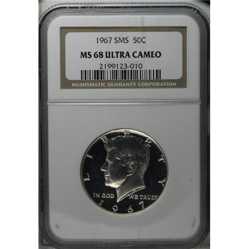 <B>1967<50C> SMS MS68 Ultra Cameo NGC.</B></I> A flashy piece, one that approaches the eye appeal of a proof, with great contrast for this issue. Traces of rose and gold appear on the devices. Census: 8 in 68 Ultra Cameo, 0 finer (9/06).