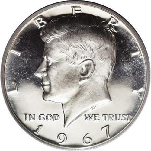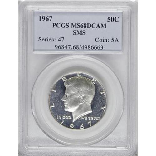 <B>1967 50C SMS MS68 Deep Cameo PCGS.</B></I> 1967 saw the last of the three Special Mint Sets, before the Mint resumed adding mintmarks to coinage and shifted production of proof sets to San Francisco, where it remains to this day. The 1967 Kennedy halves are somewhat more available than the 1965s and 1966s with deep cameo contrast, while still elusive. The present piece offers an awesome strike with jet-black fields and nicely frosted devices, virtually indistinguishable from a true proof. A small mark on Kennedy's nose is the only discernible flaw. Another finest known from this fabulous consignment. Population: 6 in 68, 0 finer (10/07).<BR><I>From The Kallenberg #1 PCGS Registry Set Of Proof Half Dollars.</B></I><BR><BR><b>Shipping:</b> Coins & Currency (<a target="_blank" href="http://www.heritageauctions.com/common/shipping.php">view shipping information</a>)