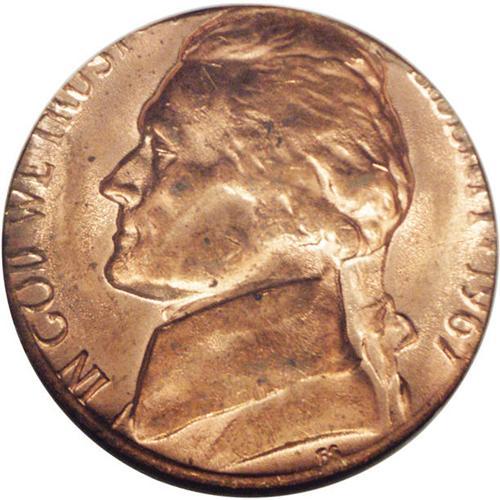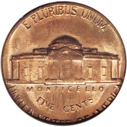 <B>1967<5C> Jefferson Nickel--Struck on a Cent Planchet--MS65 Red NGC.</B></I> A fully brilliant and highly lustrous Gem with excellent orange mint color. Although struck on a smaller diameter planchet, the date and nearly all of the lettering remain visible.