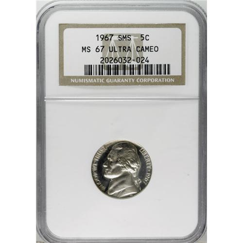 <B>1967 5C SMS MS67 Ultra Cameo NGC.</B></I> A hint of gold toning graces this otherwise brilliant Superb Gem. The major devices are magnificently frosted, unlike most SMS pieces seen. Flawless from a technical perspective, although the steps and jaw lack absolute detail. Census: 15 in 67 Ultra Cameo, 2 finer (9/06).<BR><BR><b>Shipping:</b> Coin/Currency (<a target="_blank" href="http://www.heritageauctions.com/common/shipping.php">view shipping information</a>)