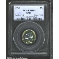 <TABLE cellSpacing=0 cellPadding=0 width="100%" bgColor=#000000 border=0><TBODY><TR><TD width="100%"><TABLE cellSpacing=1 cellPadding=3 width="100%" border=0><TBODY><TR><TD width="100%" bgColor=#79735c><FONT face=arial color=#ffffff size=3><B>Description</B> </FONT></TD></TR><TR><TD width="100%" bgColor=#ffffff><FONT face=arial size=2><B>1967 5C SMS MS68 PCGS.</B></I> Splendid pastel toning in eye catching shades of blue, gold, and lavender rests atop sparkling surfaces. Population: 3 in 68, 0 finer (8/03). </FONT></TD></TR></TBODY></TABLE></TD></TR></TBODY></TABLE><BR><A name=PricesRealized></A><TABLE cellSpacing=0 cellPadding=0 width="100%" bgColor=#000000 border=0><TBODY><TR><TD width="100%"><TABLE cellSpacing=1 cellPadding=3 width="100%" border=0><TBODY><TR><TD width="100%" bgColor=#79735c><A name=PR><FONT face=arial color=#ffffff size=3><B>Previous Prices from Heritage Auctions</B> </FONT></A></TD></TR><TR><TD bgColor=#f6f6ed><TABLE cellSpacing=0 cellPadding=0 width="100%" border=1><TBODY><TR><TD align=middle width="33%"><B>Date</B></TD><TD align=middle width="33%"><B>Service</B></TD><TD align=middle width="33%"><B>Price</B></TD></TR><TR bgColor=whitesmoke><TD width="33%"><B>08/05/2003</B></TD><TD width="33%">NGC</TD><TD width="33%">$41.40</TD></TR><TR bgColor=whitesmoke><TD width="33%"><B>04/23/2002</B></TD><TD width="33%">NGC</TD><TD width="33%">$29.90</TD></TR><TR bgColor=whitesmoke><TD width="33%"><B>04/09/2002</B></TD><TD width="33%">NGC</TD><TD width="33%">$29.90</TD></TR><TR bgColor=whitesmoke><TD width="33%"><B>03/26/2002</B></TD><TD width="33%">NGC</TD><TD width="33%">$24.15</TD></TR></TBODY></TABLE></TD></TR><TR><TD bgColor=#ffffff><FONT face=arial size=1 ?>PLEASE NOTE: All prices realized reflect the final hammer price PLUS the buyer's premium in auctions that charge a buyer's premium. Each item has a notation at the top of the listing indicating whether that lot included a buyer's premium. Example: A item that sells with a final hammer price of $100 and a 20% buyer's premium will display with a price realized of $120. All information listed is intended to be as accurate as possible, but errors are possible. Please use this guide carefully and inform us of any inaccuracies. </FONT></TD></TR></TBODY></TABLE></TD></TR></TBODY></TABLE><BR><TABLE cellSpacing=0 cellPadding=0 width="100%" bgColor=#000000 border=0><TBODY><TR><TD width="100%"><TABLE cellSpacing=1 cellPadding=3 width="100%" border=0><TBODY><TR><TD width="100%" bgColor=#79735c colSpan=6><FONT face=arial color=#ffffff size=3><B>Price Guide*</B> </FONT></TD></TR><TR bgColor=#f6f6ed><TD align=middle><B>Grade</B> </TD><TD align=middle><B>Coin World<BR>(Trends)</B> </TD><TD align=middle><B>Numismedia<BR>Retail</B> </TD><TD align=middle><B>Numismedia<BR>Wholesale</B> </TD><TD align=middle><B>Coin<BR>Universe</B> </TD><TD align=middle><B>Heritage<BR>Value Index</B> </TD></TR><TR bgColor=#ffffff><TD align=middle>67</TD><TD align=right>---</TD><TD align=right>---</TD><TD align=right>---</TD><TD align=right>$45.00</TD><TD align=right>$31.50</TD></TR><TR style="FONT-WEIGHT: bold" bgColor=#cccfdd><TD align=middle>68</TD><TD align=right>---</TD><TD align=right>---</TD><TD align=right>---</TD><TD align=right>$75.00</TD><TD align=right>$52.50</TD></TR><TR bgColor=#ffffff><TD align=middle>69</TD><TD align=right>---</TD><TD align=right>---</TD><TD align=right>---</TD><TD align=right>---</TD><TD align=right>---</TD></TR><TR bgColor=#ffffff><TD colSpan=6><FONT size=1>*All information listed is intended to be as accurate as possible, but errors are possible. No item may be returned or refused based on this information which is provided as a service to our customers. You should contact each pricing source directly to determine the accuracy of this information. </FONT></TD></TR></TBODY></TABLE></TD></TR></TBODY></TABLE><BR><TABLE cellSpacing=0 cellPadding=0 width="100%" bgColor=#000000 border=0><TBODY><TR><TD width="100%"><TABLE cellSpacing=1 cellPadding=3 width="100%" border=0><TBODY><TR><TD width="100%" bgColor=#79735c><FONT face=arial color=#ffffff size=3><B>Population Guide</B> </FONT></TD></TR><TR bgColor=#ffffff><TD align=middle><!-- Begin Output of Population Grid--><TABLE cellSpacing=0 cellPadding=0 width="100%" border=0><TBODY><TR><TD vAlign=center><TABLE cellSpacing=0 width="100%" border=1 cellsadding="3"><TBODY><TR><TD vAlign=center><TABLE cellSpacing=0 cellPadding=3 width="100%" border=1><TBODY><TR><TD vAlign=center align=middle bgColor=#f0f1e8 colSpan=2 <CENTER><FONT face=Arial size=2><B>PCGS Pop </B></FONT><CENTER></CENTER></TD><TD vAlign=center align=middle bgColor=#f0f1e8 colSpan=2><CENTER><FONT face=Arial size=2><B>NGC Pop</B></CENTER></FONT></TD></TR><TR><TD vAlign=center><FONT face=Arial size=2>(68)</FONT> </TD><TD vAlign=center align=right><FONT face=Arial size=2>3</FONT> </TD><TD vAlign=center><FONT face=Arial size=2>(68)</FONT> </TD><TD vAlign=center align=right><FONT face=Arial size=2>36</FONT> </TD></TR><TR><TD vAlign=center><FONT face=Arial size=2>(>68)</FONT> </TD><TD vAlign=center align=right><FONT face=Arial size=2>0</FONT> </TD><TD vAlign=center><FONT face=Arial size=2>(>68)</FONT> </TD><TD vAlign=center align=right><FONT face=Arial size=2>0</FONT> </TD></TR></TBODY></TABLE></TD></TR></TBODY></TABLE></TD></TR></TBODY></TABLE><!-- End Output of Population Grid--> Important notice: Heritage usually auctions material at the rate of 200-250 lots per hour. On some occasions eBay Live bid software or the Internet may not be able to keep up with the pace of the auction. We recommend placing a realistic absentee bid now as insurance to avoid disappointment. Occasionally the auctioneer may eliminate or reject an eBay Live bid, and the auctioneer may also reopen a lot after the close of the eBay live bidding (usually because we missed an audience bid), and may reject your bid even if it shows you as the winning bidder. By bidding via eBay Live, you agree that Heritage may award the lot to another bidder at its sole di