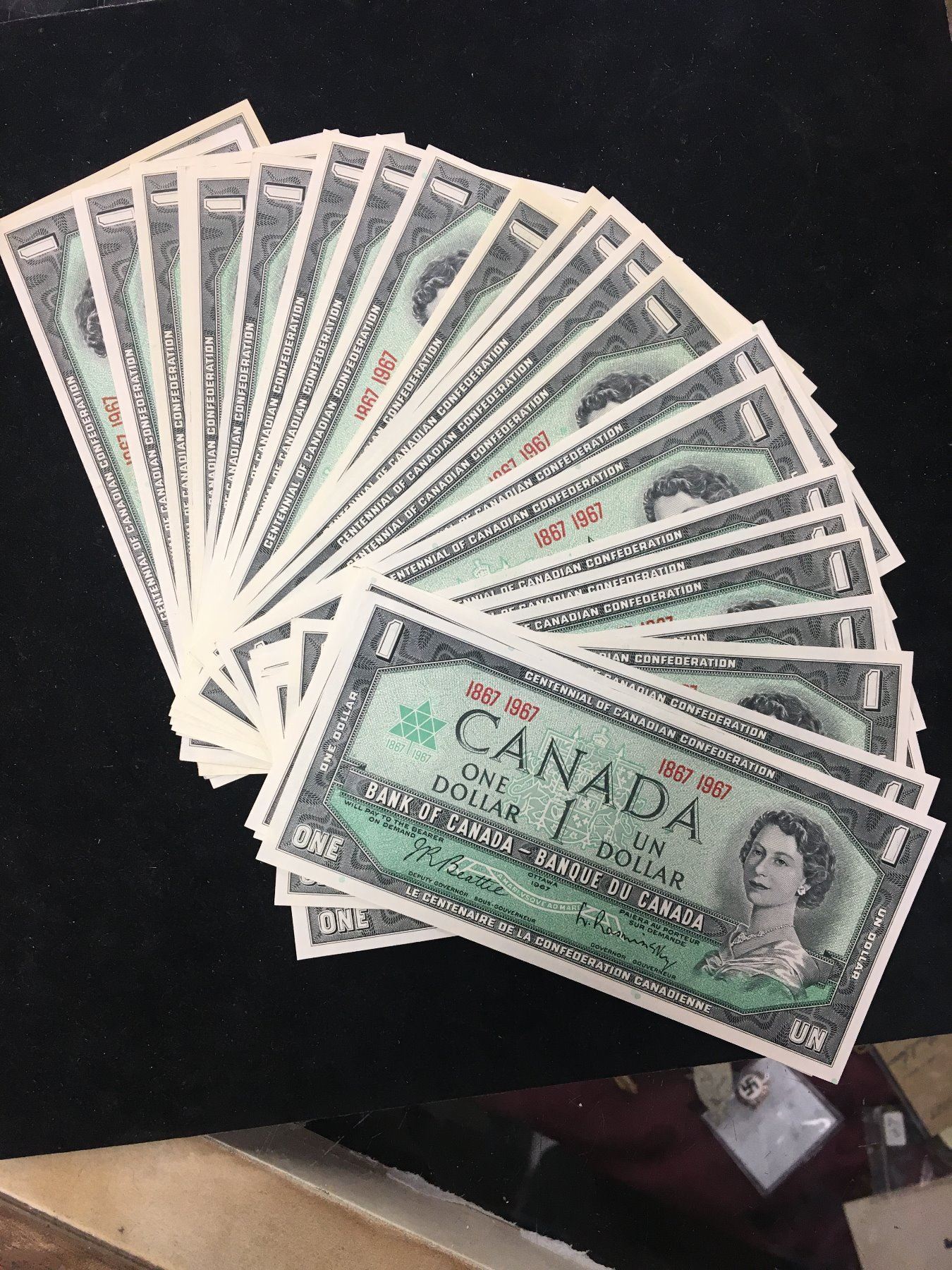 NICE BULK LOT OF 29 1967 CANADA $1 NOTES! AU-UNC.MOST ARE UNC!