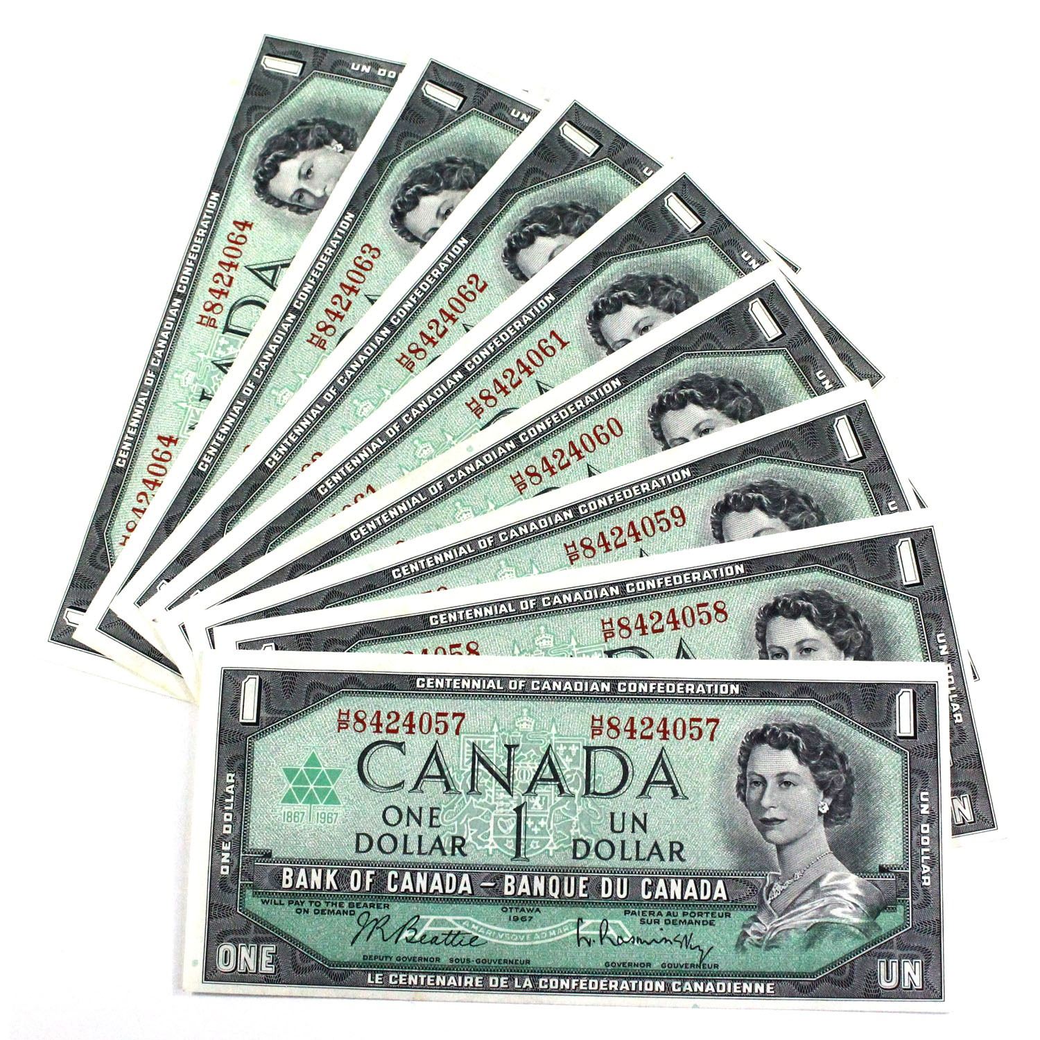1967 Bank of Canada $1 Notes Beattie-Rasminsky Signatures with Consecutive Serial Numbers H/P8424057-063 UNC. 8pcs
