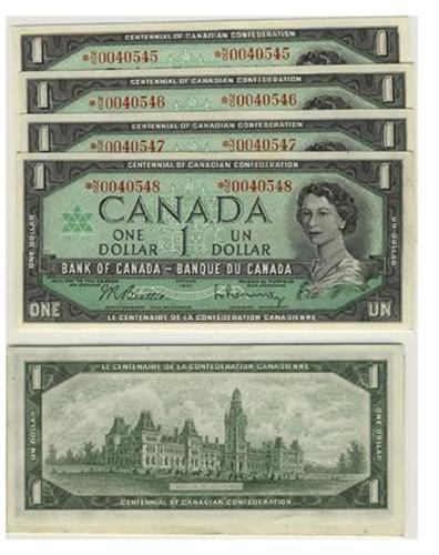 Scarce asterisk prefix. Crisp unc sequential run of 4 notes with heavy diagonal counting crease. Light mishandling, one note has very minor stain and one with crease. *N/O0040545-0040548, BC-45bA no return.