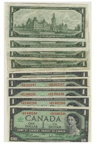 9 centennial commemorative $1.00 notes in VG to EF grade. All notes are mostly fresh, well centred. Miscellaneous serial numbers with *B/M prefix. BC-45bA-I, no return.